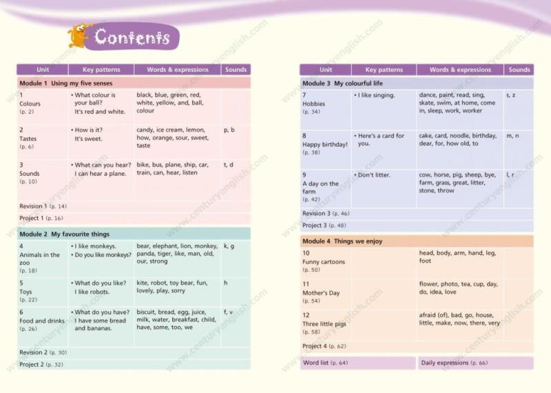 教材采用“模块建筑式(building-blocks approach)”编写体系。模块建筑的理论基础是学生的学习过程和学习能力是不断发展的,即学生已知的语言知识和已获得的语言技能将成为他们进一步开展语言学习的基础。本套教材以模块(Module)为单位组织教学内容,模块内的语言材料围绕一个主题展开;各模块包含三个单元(Unit),每个单元集中讨论该主题下的一个具体话题。教材各模块之间互相补充,互相配合,保证语言知识和语言技能螺旋式上升;同一模块主题在不同年级循环出现,保证教学内容复现和循环。