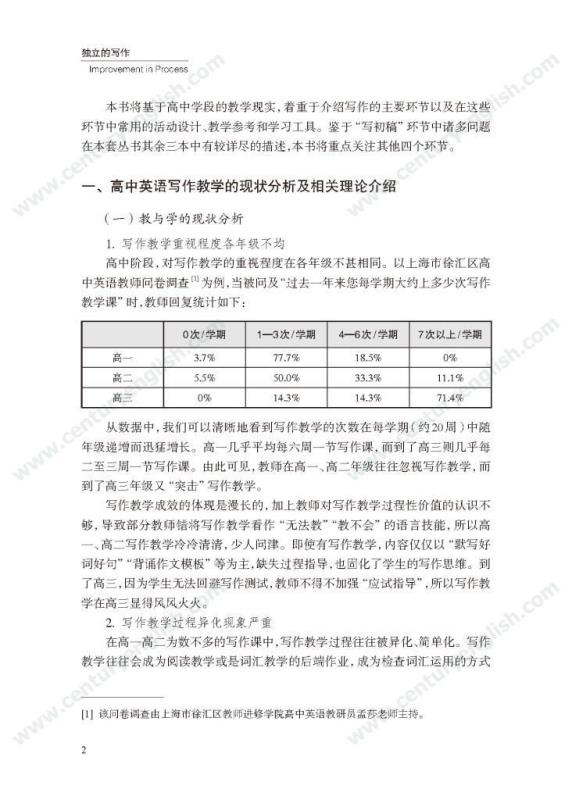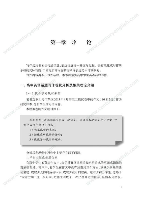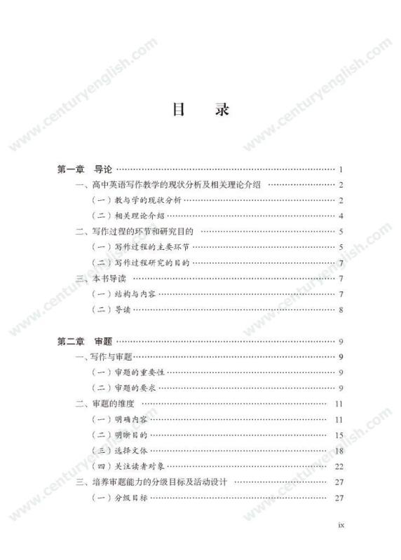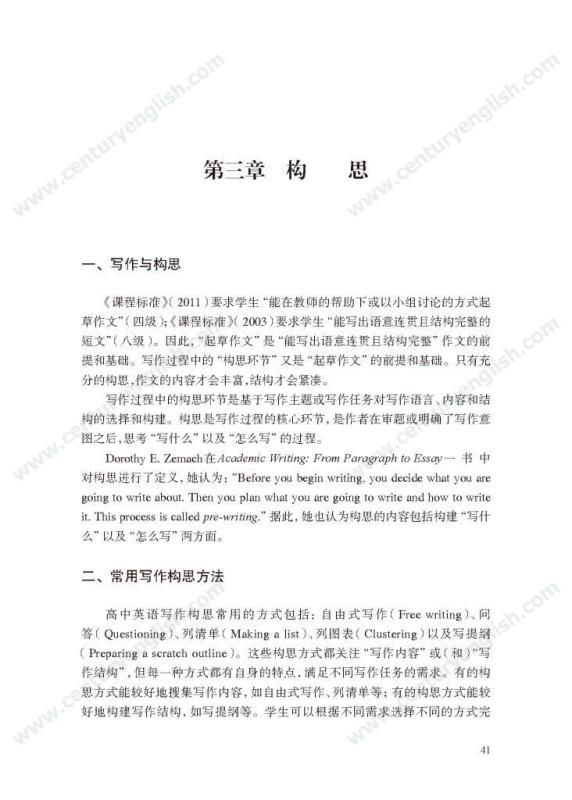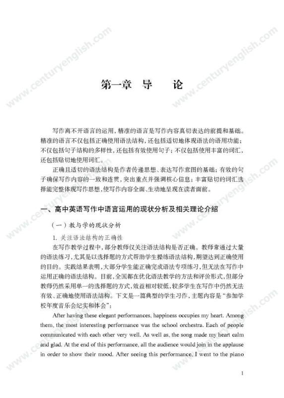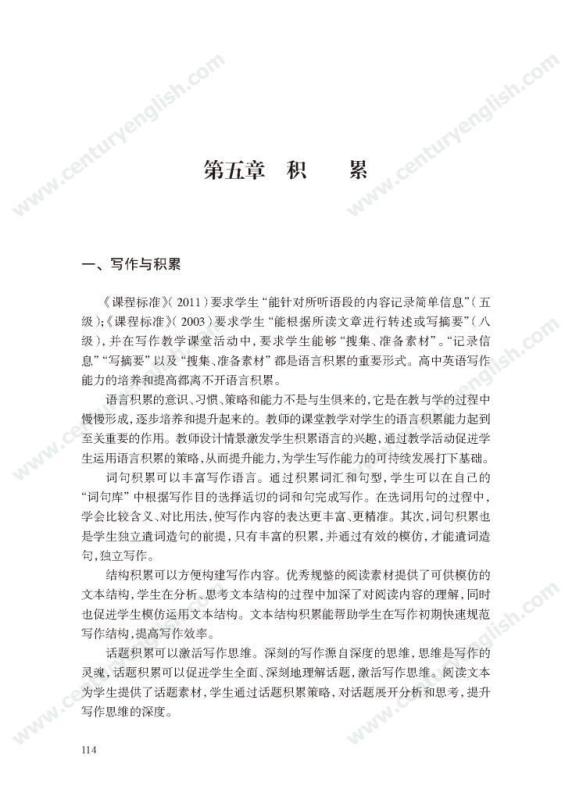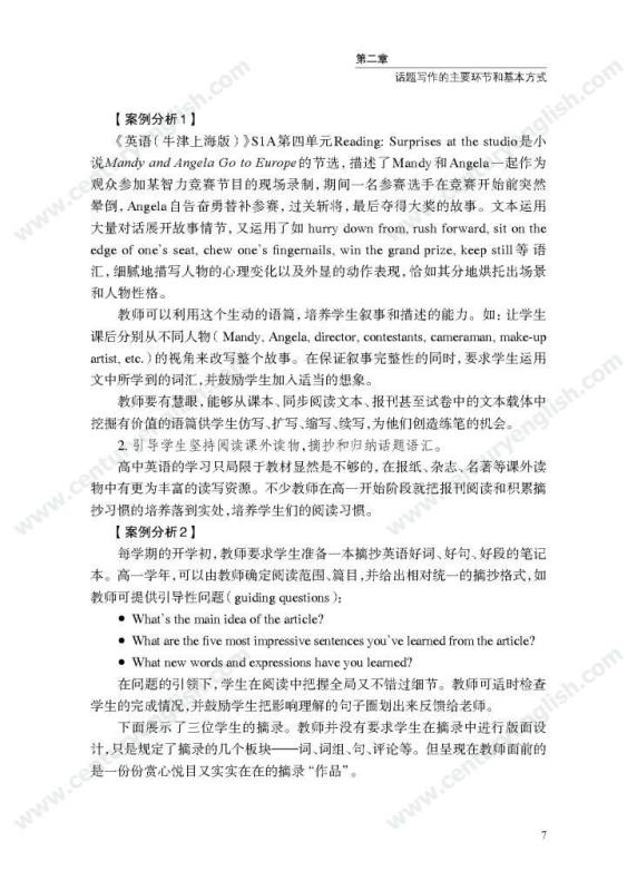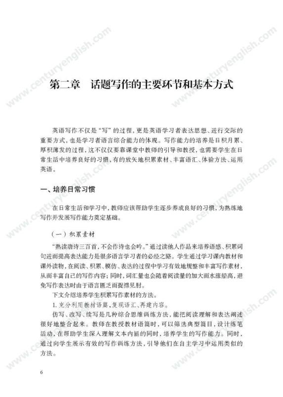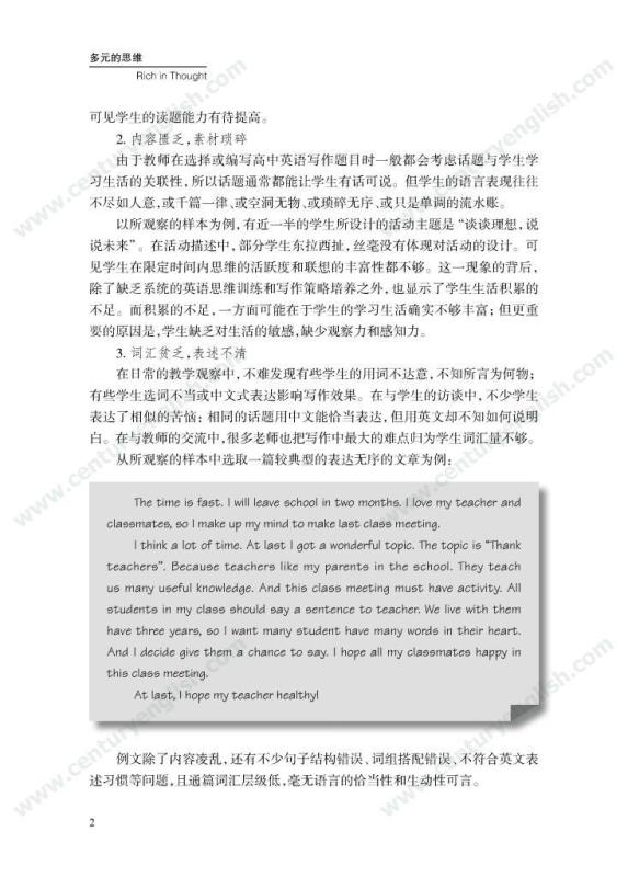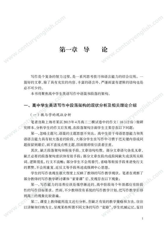 本套丛书共四册,分别为《精准的语言》《严密的结构》《多元的思维》和《独立的写作》。其中,《精准的语言》强调语法结构的功能分析,体现语法结构在写作中的语用功能,并关注有效句子表达时应遵守的诸多原则,例如完整性、一致性、简明性等。《严密的结构》以“文章结构和段落架构”为着眼点,探讨帮助学生写前文体定位和结构选择,写中段内和段间逻辑架构,写后整体呼应的方法和策略,引导师生关注文体与写作的关联、丰富段内和段间逻辑推进的方式,最终提升学生建立恰当的文本结构的能力。《多元的思维》以“话题写作”为切入口,基于课标话题,提出“勤于写前、理于写中、思于写后”的观点,研究和拓展丰富话题素材和语汇的途径和方法。通过对话题的立体建构,促进师生对话题内容和功能的理解,最终帮助学生建立与话题相关的语汇库,提高基于话题描写论述、表情达意的能力。《独立的写作》关注独立写作的能力培养,帮助教师梳理写作过程的各环节,通过案例展现相关教学策略的应用,提升教师写作教学效益。同时,本书还提供不同的写作工具以及其设计原则和使用策略,促进教师思考为学生提供有效的帮助和脚手架,养成独立写作的方法和习惯。