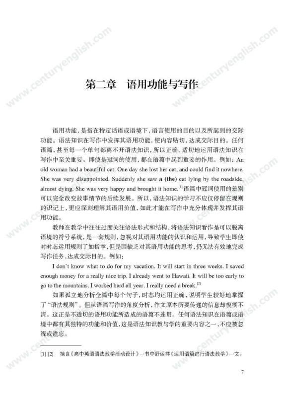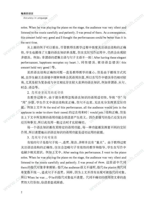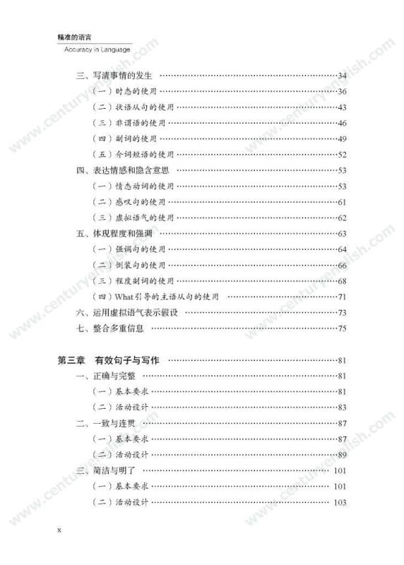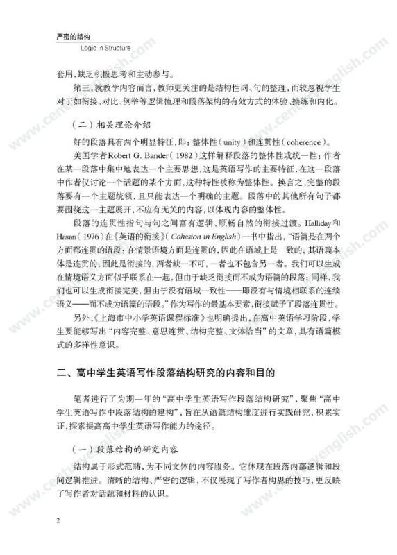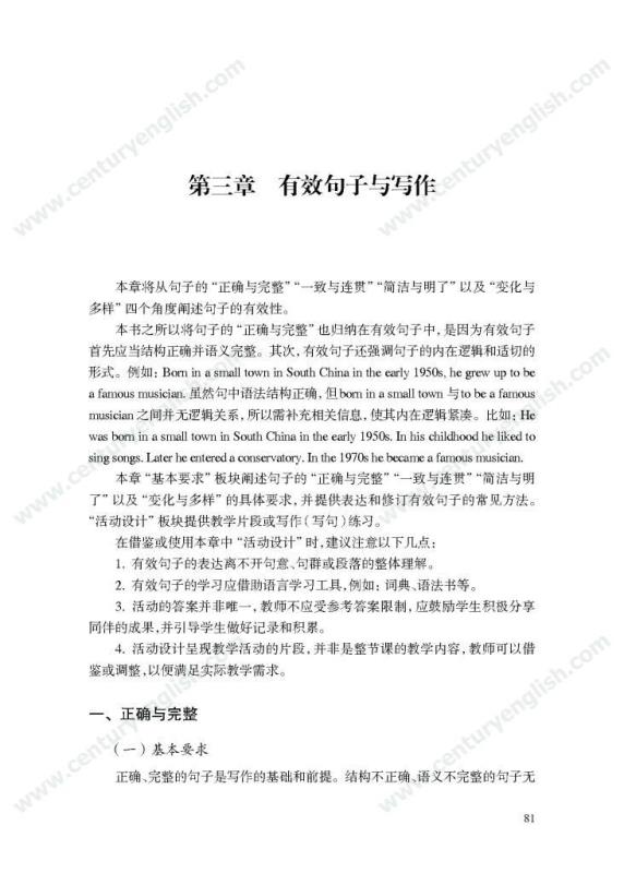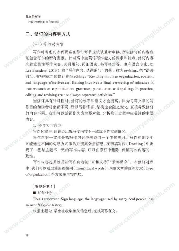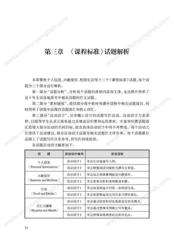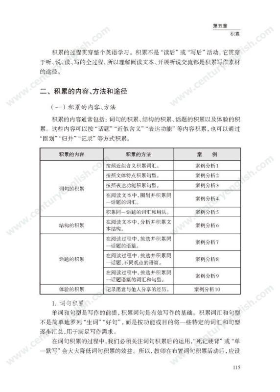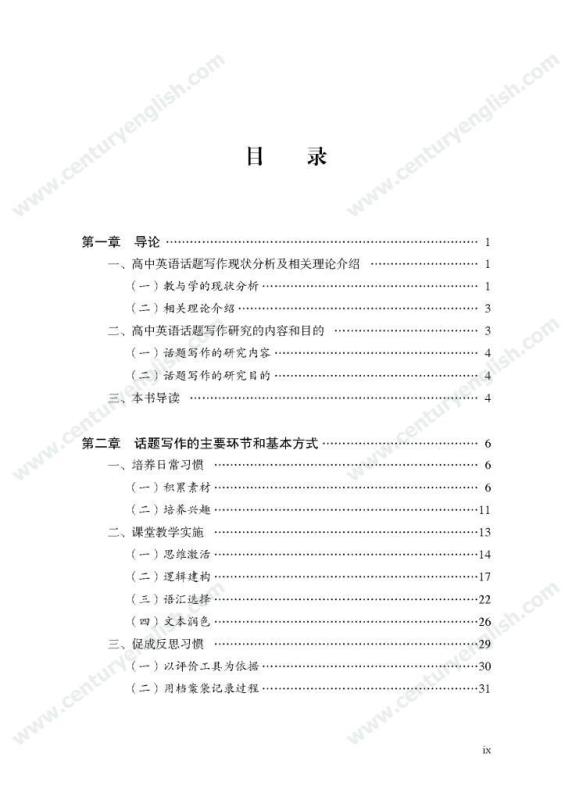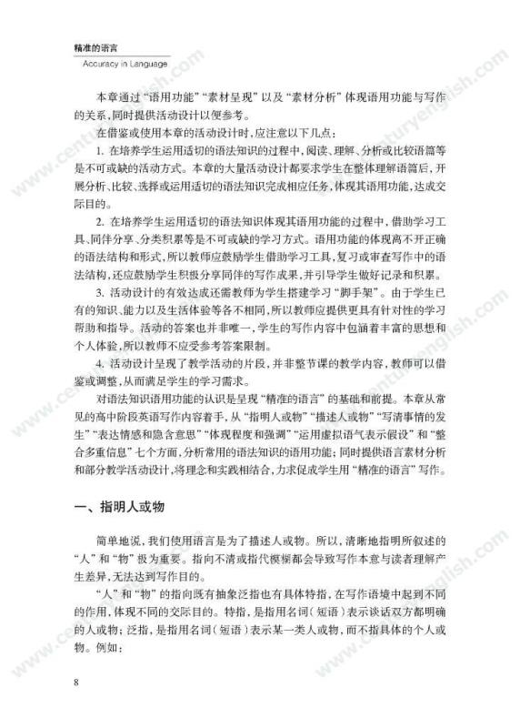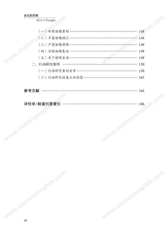 本套丛书共四册,分别为《精准的语言》《严密的结构》《多元的思维》和《独立的写作》。其中,《精准的语言》强调语法结构的功能分析,体现语法结构在写作中的语用功能,并关注有效句子表达时应遵守的诸多原则,例如完整性、一致性、简明性等。《严密的结构》以“文章结构和段落架构”为着眼点,探讨帮助学生写前文体定位和结构选择,写中段内和段间逻辑架构,写后整体呼应的方法和策略,引导师生关注文体与写作的关联、丰富段内和段间逻辑推进的方式,最终提升学生建立恰当的文本结构的能力。《多元的思维》以“话题写作”为切入口,基于课标话题,提出“勤于写前、理于写中、思于写后”的观点,研究和拓展丰富话题素材和语汇的途径和方法。通过对话题的立体建构,促进师生对话题内容和功能的理解,最终帮助学生建立与话题相关的语汇库,提高基于话题描写论述、表情达意的能力。《独立的写作》关注独立写作的能力培养,帮助教师梳理写作过程的各环节,通过案例展现相关教学策略的应用,提升教师写作教学效益。同时,本书还提供不同的写作工具以及其设计原则和使用策略,促进教师思考为学生提供有效的帮助和脚手架,养成独立写作的方法和习惯。