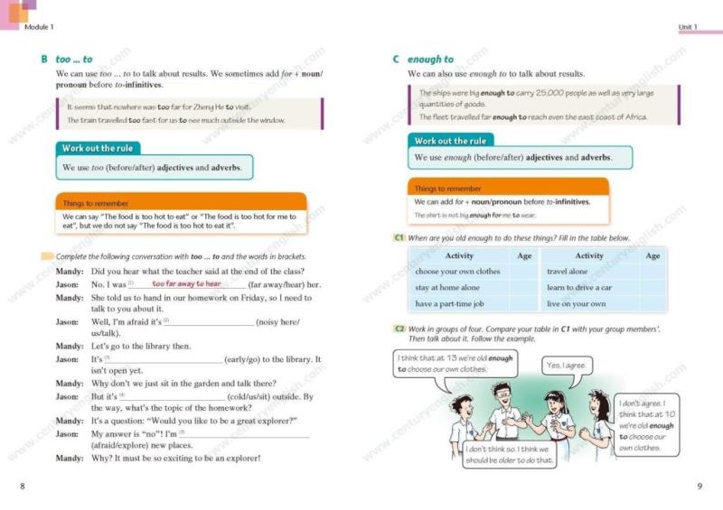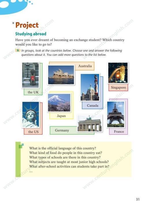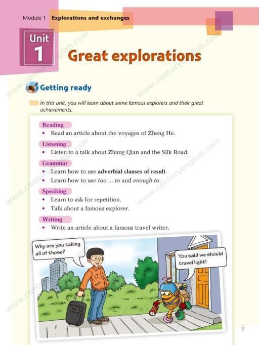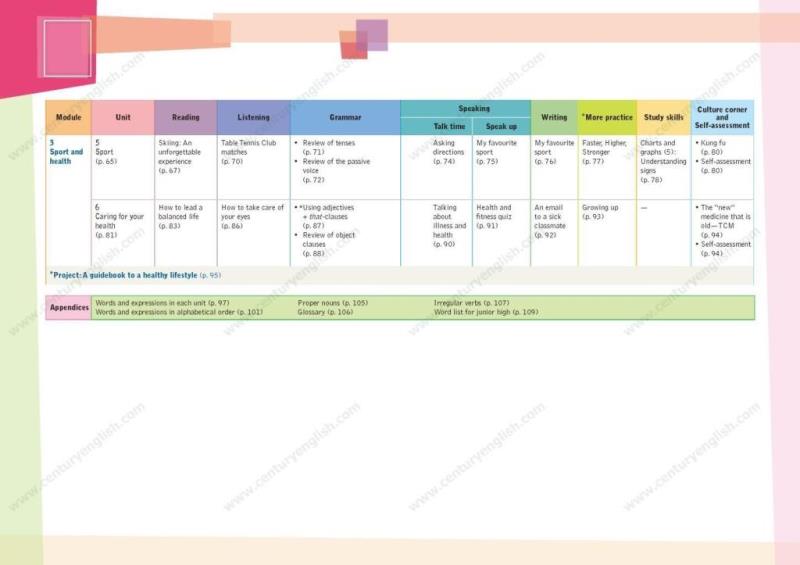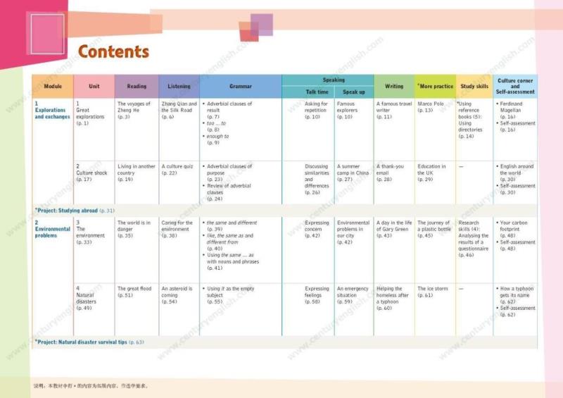 教材采用“模块建筑式(building-blocks approach)”编写体系。模块建筑的理论基础是学生的学习过程和学习能力是不断发展的,即学生已知的语言知识和已获得的语言技能将成为他们进一步开展语言学习的基础。本套教材以模块(Module)为单位组织教学内容,模块内的语言材料围绕一个主题展开;各模块包含三个单元(Unit),每个单元集中讨论该主题下的一个具体话题。教材各模块之间互相补充,互相配合,保证语言知识和语言技能螺旋式上升;同一模块主题在不同年级循环出现,保证教学内容复现和循环。