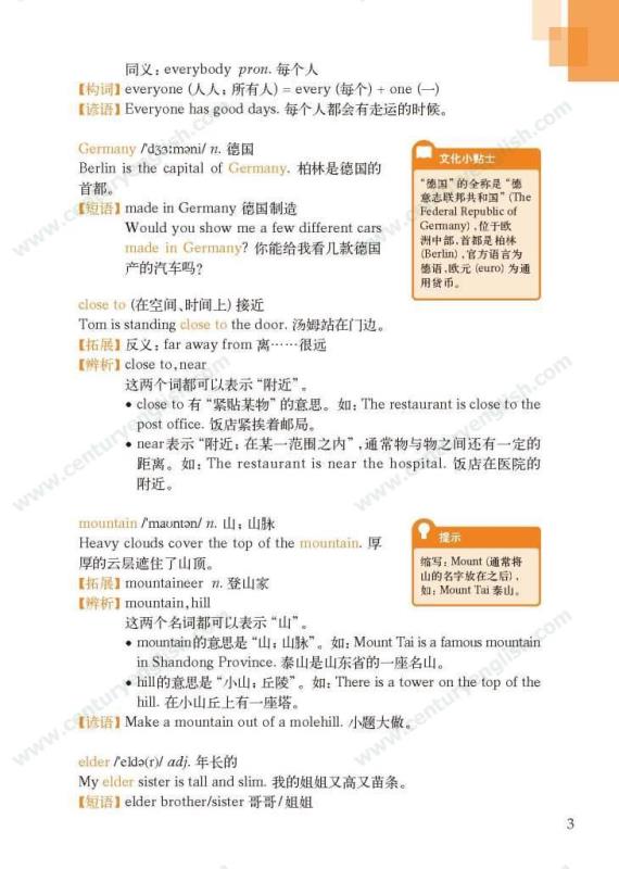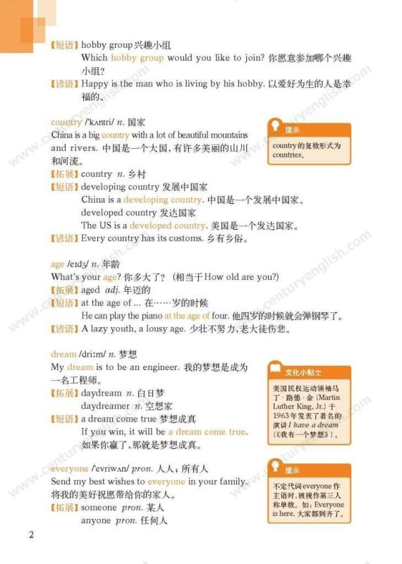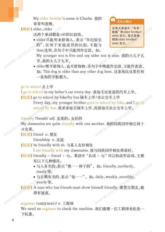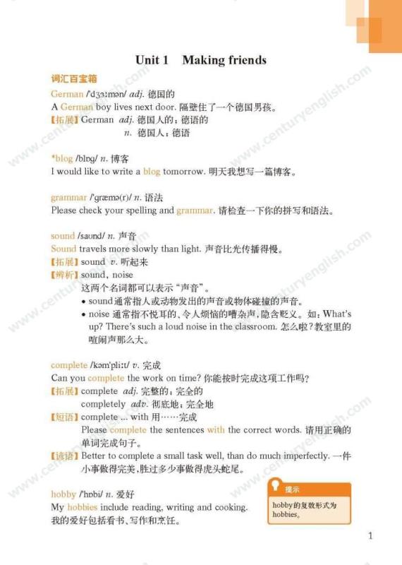 《牛津英语词汇学习手册》根据《英语》中出现的词汇编写而成。其主要特点是:1.详尽收录了《英语》中出现的各单元核心词汇与拓展词汇。词条按照单元中出现的顺序编排,方便学生进行同步学习。2. 所有词条均配有标准的国际音标、词性、中文释义、例句。大多数词条配有拓展、短语、辨析、构词、提示、谚语等等,旨在帮助学生举一反三、抓住重点和难点。部分词条配有文化小贴士,提供与该词有关的文化背景知识,有利于学生学习地道的语言。3. 提供与单词配套的强化练习,涵盖手册中出现的重要词汇,形式上与各地中考题型相近,有首字母填空、词性转换、补全对话、补全短文等。4. 书后还附有索引表,便于按字母顺序查询相关单词。