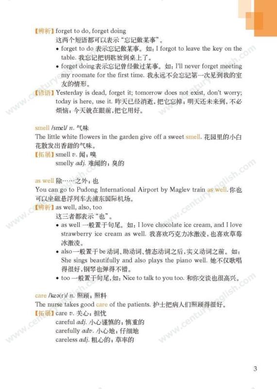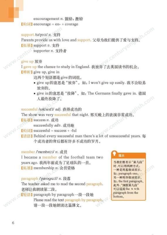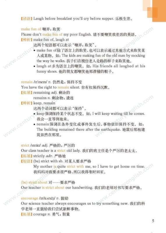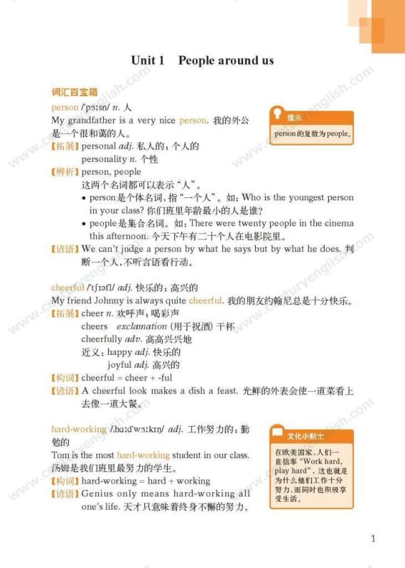 《牛津英语词汇学习手册》根据《英语》中出现的词汇编写而成。其主要特点是:1.详尽收录了《英语》中出现的各单元核心词汇与拓展词汇。词条按照单元中出现的顺序编排,方便学生进行同步学习。2. 所有词条均配有标准的国际音标、词性、中文释义、例句。大多数词条配有拓展、短语、辨析、构词、提示、谚语等等,旨在帮助学生举一反三、抓住重点和难点。部分词条配有文化小贴士,提供与该词有关的文化背景知识,有利于学生学习地道的语言。3. 提供与单词配套的强化练习,涵盖手册中出现的重要词汇,形式上与各地中考题型相近,有首字母填空、词性转换、补全对话、补全短文等。4. 书后还附有索引表,便于按字母顺序查询相关单词。