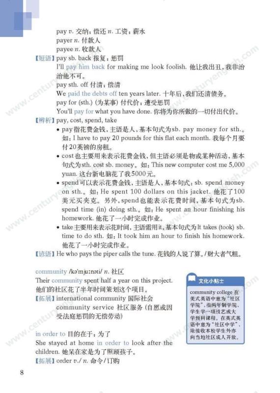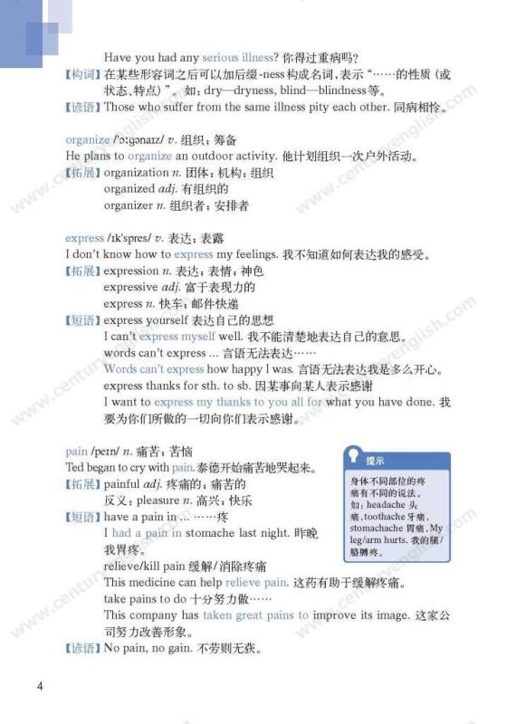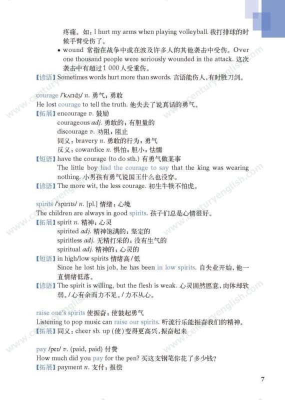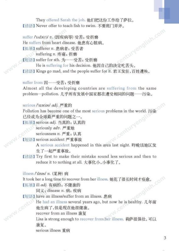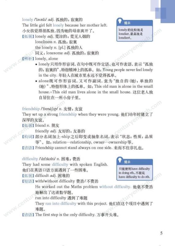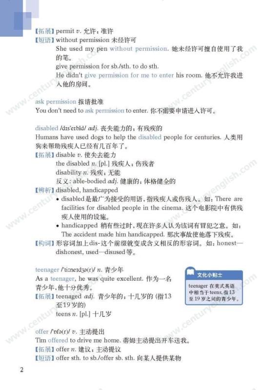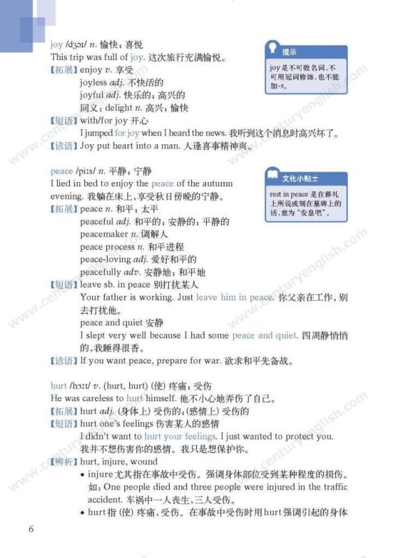 《牛津英语词汇学习手册》根据《英语》中出现的词汇编写而成。其主要特点是:1.详尽收录了《英语》中出现的各单元核心词汇与拓展词汇。词条按照单元中出现的顺序编排,方便学生进行同步学习。2. 所有词条均配有标准的国际音标、词性、中文释义、例句。大多数词条配有拓展、短语、辨析、构词、提示、谚语等等,旨在帮助学生举一反三、抓住重点和难点。部分词条配有文化小贴士,提供与该词有关的文化背景知识,有利于学生学习地道的语言。3. 提供与单词配套的强化练习,涵盖手册中出现的重要词汇,形式上与各地中考题型相近,有首字母填空、词性转换、补全对话、补全短文等。4. 书后还附有索引表,便于按字母顺序查询相关单词。