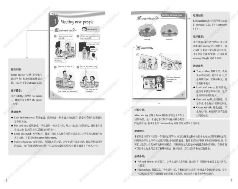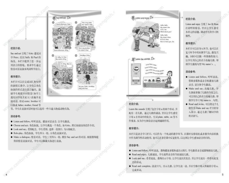 为了帮助教师建立单元整体教学的意识,《教师用书》以“书中书”的形式提供了所有栏目的栏目介绍、教学提示与活动参考。“栏目介绍”帮助教师明确栏目要求,准确理解栏目意图;“教学提示”提供了一些关于灵活处理教材的小贴士;“活动参考”针对每个栏目的材料本身提供了若干活动建议。《教师用书》还包括单元纵览和一份参考教案(含课时分配建议)。