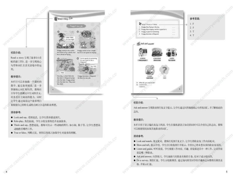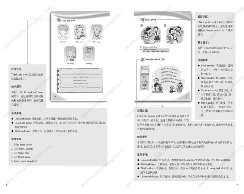 为了帮助教师建立单元整体教学的意识,《教师用书》以“书中书”的形式提供了所有栏目的栏目介绍、教学提示与活动参考。“栏目介绍”帮助教师明确栏目要求,准确理解栏目意图;“教学提示”提供了一些关于灵活处理教材的小贴士;“活动参考”针对每个栏目的材料本身提供了若干活动建议。《教师用书》还包括单元纵览和一份参考教案(含课时分配建议)。