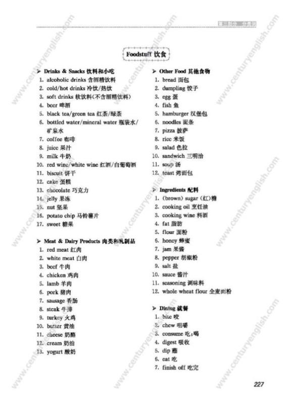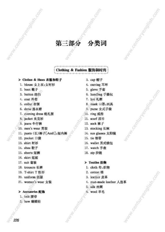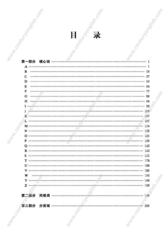 第三部分 分类词。对部分核心词进行了分类,目的是方便学生根据主题或话题通过联想来学习和复习词汇。分类的主要依据是《教学基本要求》中的“话题”和现行使用的《英语(牛津上海版)》和《英语(新世纪版)》两套教材,并参考了国内外的相关文献。