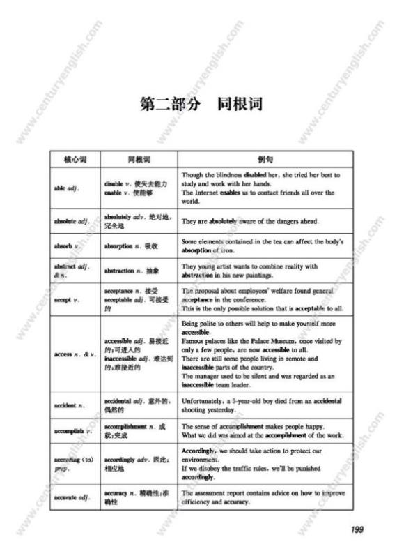 第二部分 同根词。依据《教学基本要求》核心词汇和构词法的学习内容,按字母顺序以部分核心词为“词根”,通过添加“前缀”或“后缀”构成派生词,给出派生词的词性、释义和例句。
