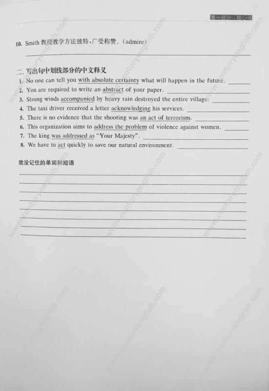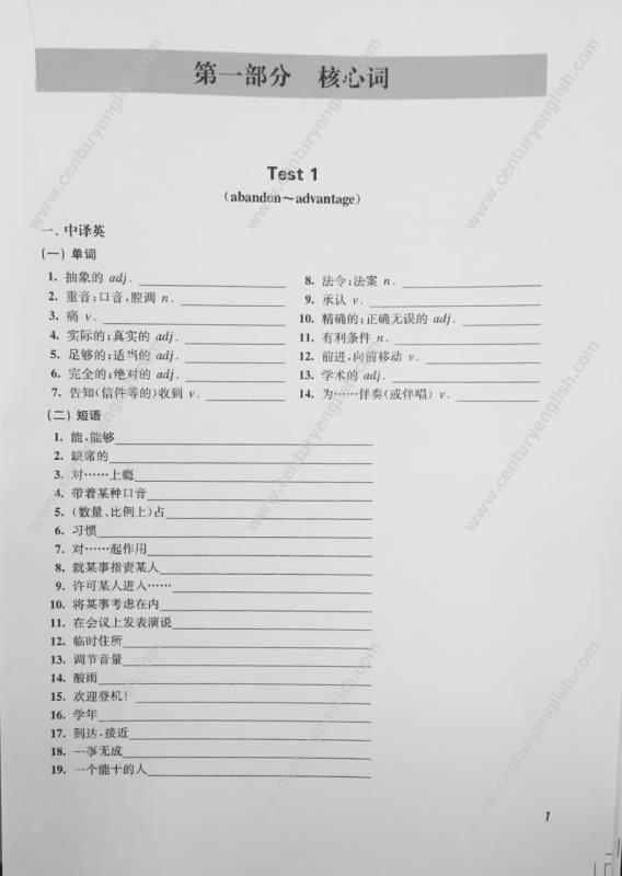 第一部分 核心词。共50个test, 按照字母顺序排列,每个test由中译英和英译中两部分组成,其中中译英部分包括单词默写、短语默写、补全句子和句子翻译等形式,英译中部分为写出句中划线部分的中文释义。