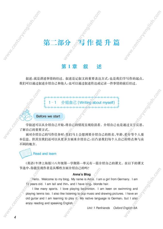 本书主要由“写作提升篇”和“中考实战篇”组成。“写作提升篇”重点指导学生如何运用五种基本文体(叙述、描写、说明、议论、应用)进行写作,养成基本的英语写作习惯,提高英语写作能力。“中考实战篇”重点指导学生如何根据上海市中考写作命题要求进行写作,提升中考实战能力。