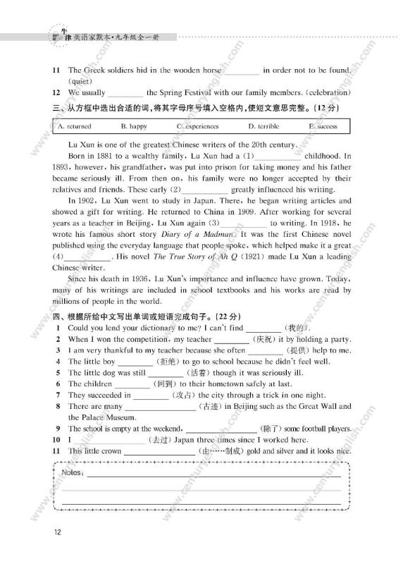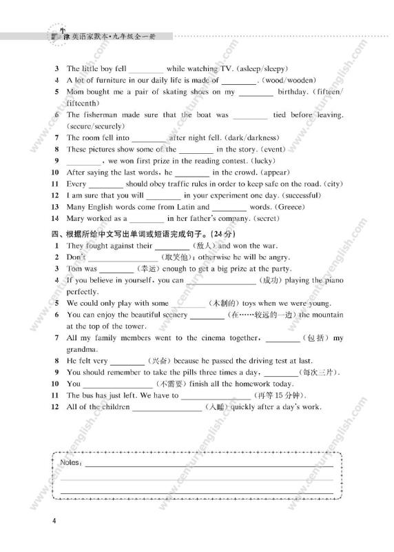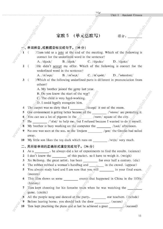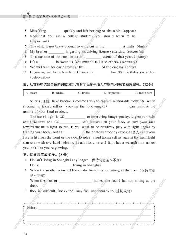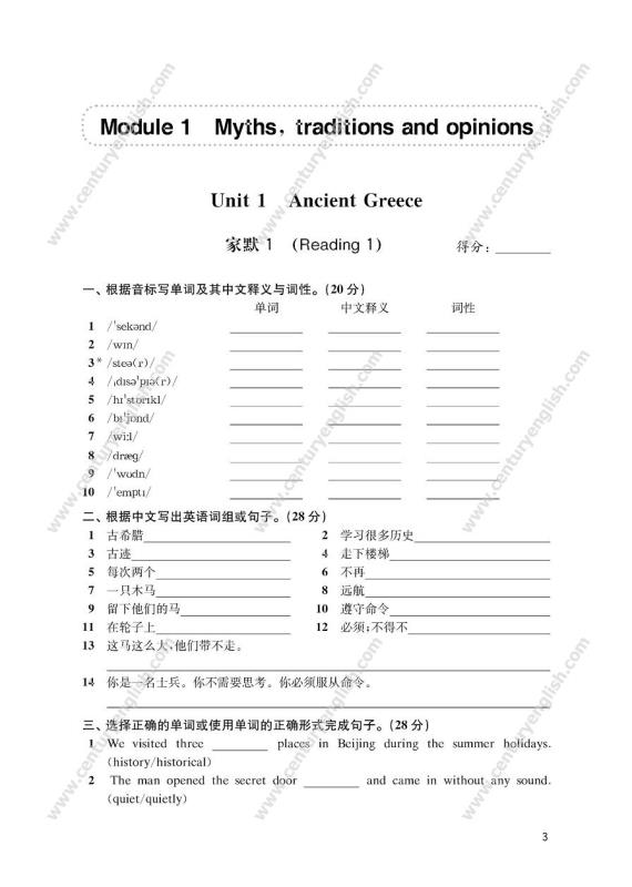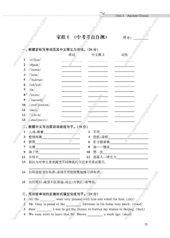 家默1~家默4包含单词与词组默写、词汇活用练习(如选词填空、连词成句、首字母填空、句型转换等)两部分,供学生在学完教材各板块之后进行词汇学习情况的自我检测,其中家默4与教材More practice板块呼应,整体标注星号(*),可供学有余力的学生选做;家默5通过多种词汇活用练习对本单元中需要学生重点掌握的词汇进行综合考查,检测学生对本单元词汇的整体掌握情况;家默6主要检测在该单元出现的中考必考词汇,供学生提前对中考考点词汇进行梳理,打好中考复习的基础。紧贴《英语(牛津上海版)九年级第一学期》和《英语(牛津上海版)九年级第二学期》教材编写,全方位解决九年级学生“回家默写”的英语学习需求。